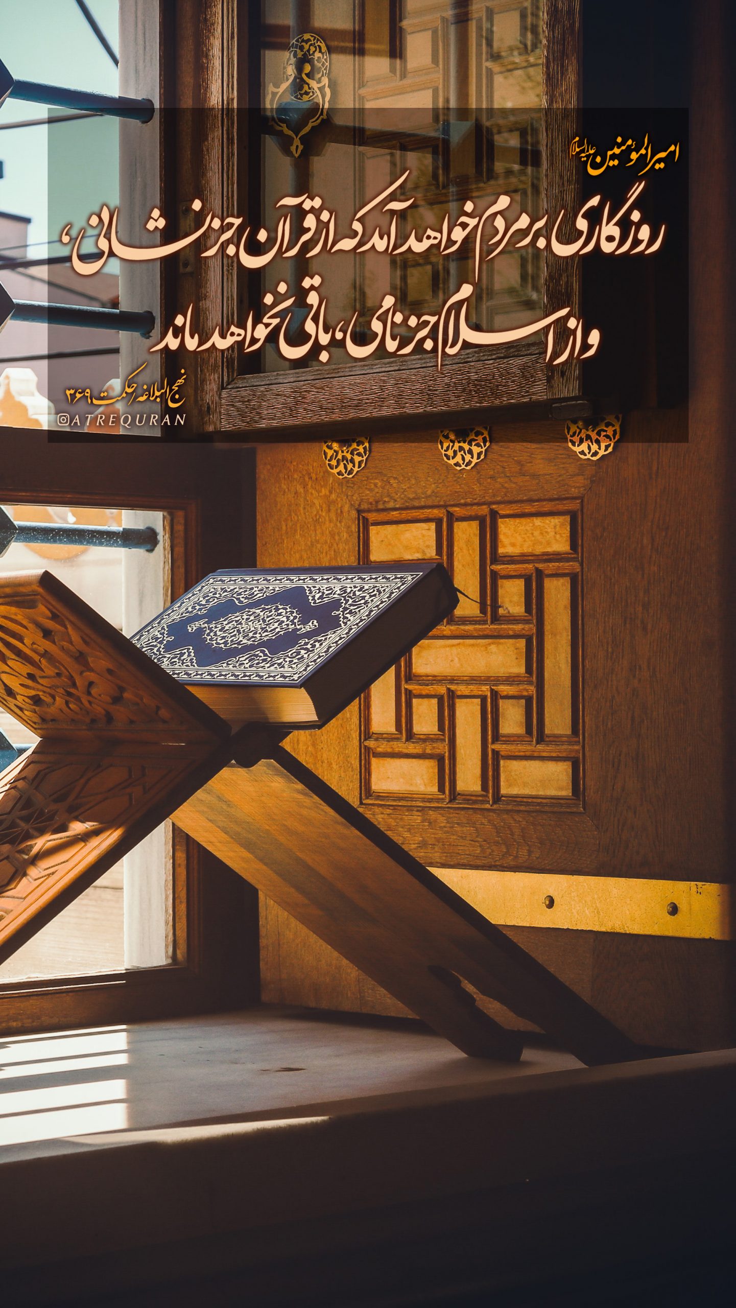 ?و درود خدا بر او، فرمود: روزگارى بر مردم خواهد آمد كه از قرآن جز نشانى، و از اسلام جز نامى، باقى نخواهد ماند.