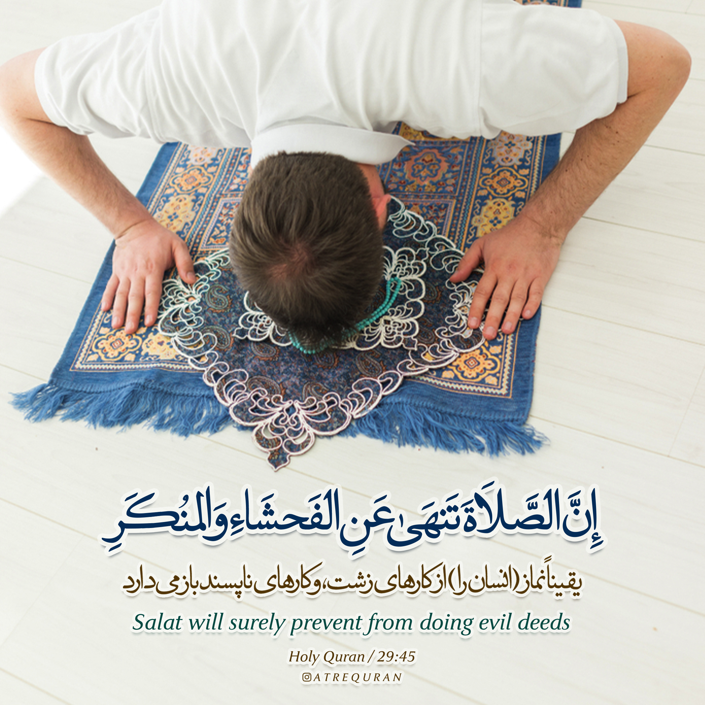 ?اُتْلُ ما أُوحِيَ إِلَيْكَ مِنَ الْكِتابِ وَ أَقِمِ الصَّلاةَ إِنَّ الصَّلاةَ تَنْهى عَنِ الْفَحْشاءِ وَ الْمُنْكَرِ وَ لَذِكْرُ اللَّهِ أَكْبَرُ وَ اللَّهُ يَعْلَمُ ما تَصْنَعُونَ ?