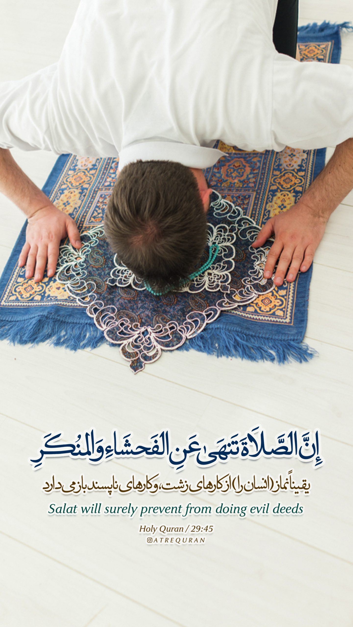 ?آنچه را از این کتاب به تو وحی شده است، بخوان و نماز را برپا دار، یقیناً نماز از کارهای زشت، و کارهای ناپسند باز می دارد؛ و همانا ذکر خدا بزرگ تر است، و خدا آنچه را انجام می دهید، می داند.?