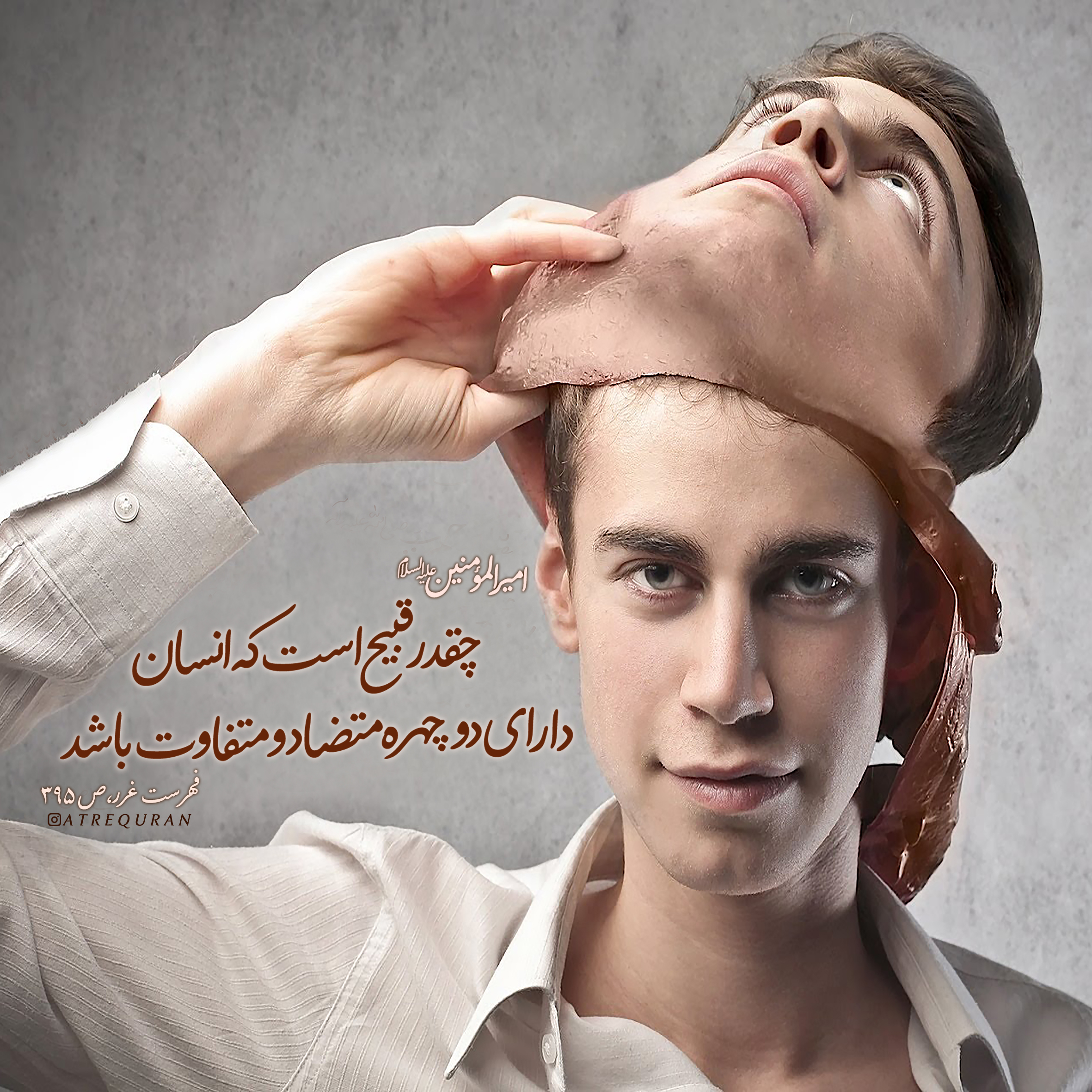 انسان دو چهره تاریخ انتشار 6 بهمن 1399 دسته بندی حدیث گرافی دانلود عکس نوشته در اندازه مربعی (185 بار دانلود شده) ?امیرالمؤمنین علیهالسلام ?ما اَقبَحَ بِالانسانِ أَنْ یكونَ ذاوَجهَین? ?چقدر قبیح است که انسان دارای دو چهره متضاد و متفاوت باشد.? ?فهرست غرر، ص ٣٩٥