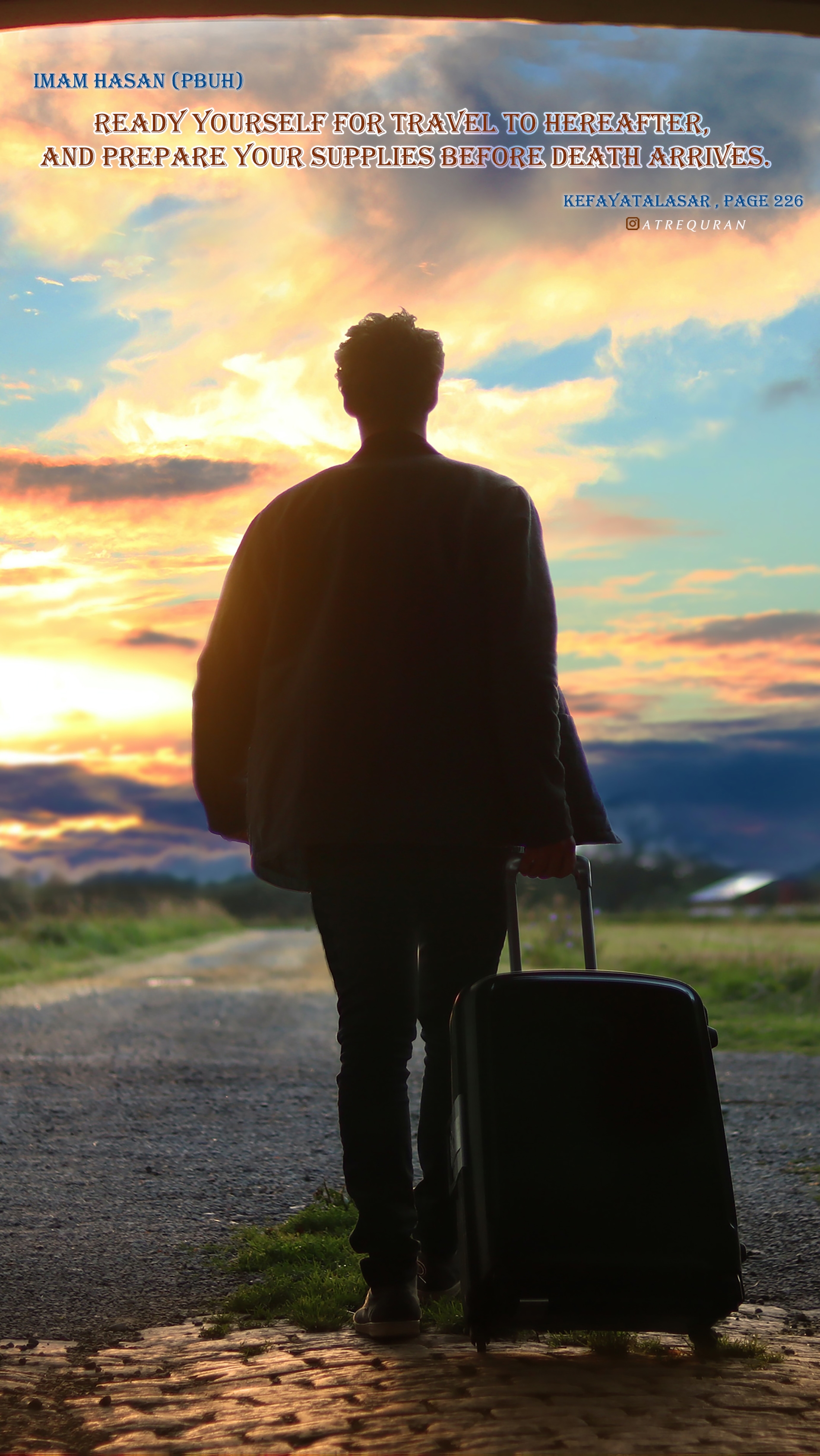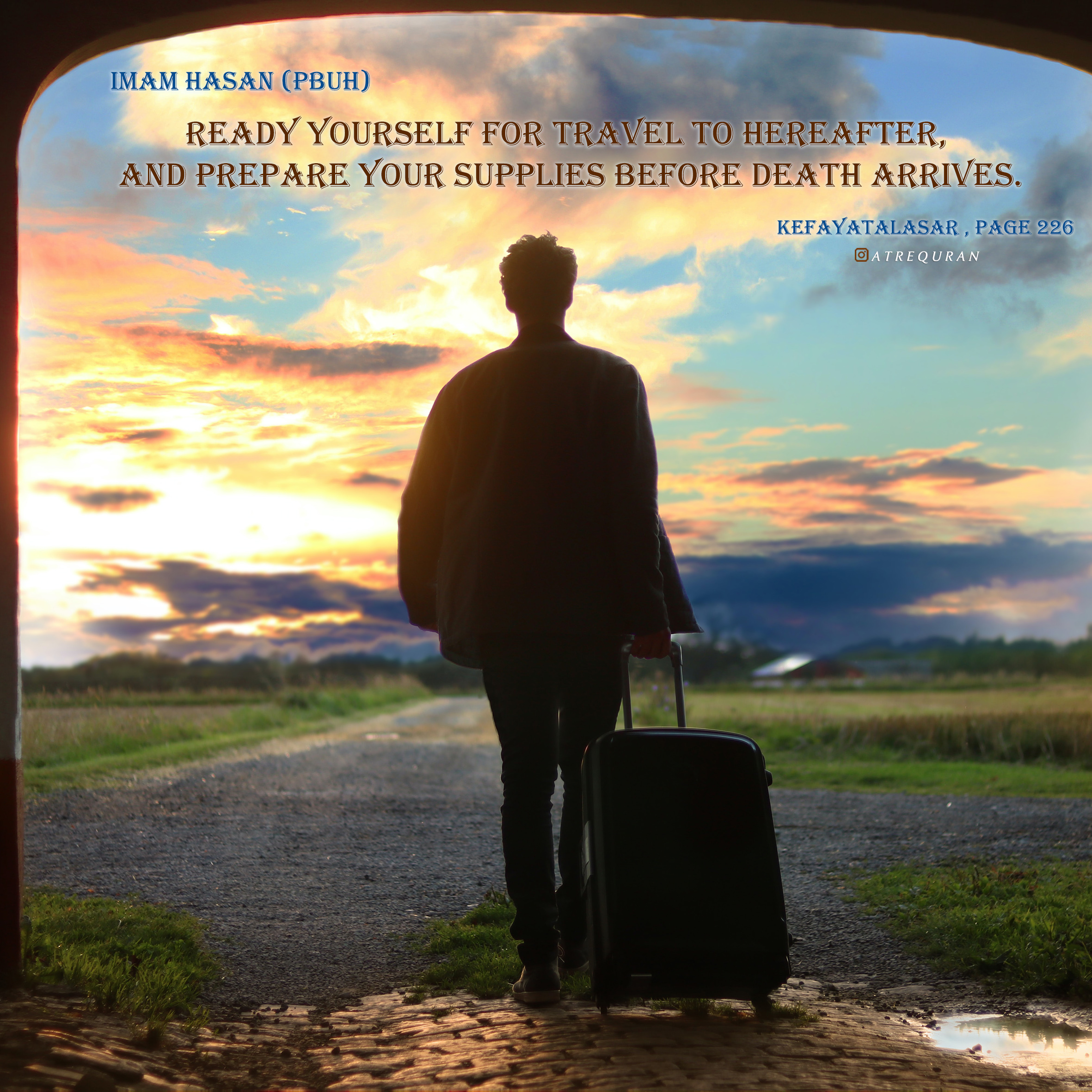 «اِسْتَعِدَّ لِسَفَرِکَ وَ حَصِّلْ زادَکَ قَبْلَ حُلُولِ اَجَلِکَ وَاعْلَمْ اَنَّکَ تَطْلُبُ الدُّنْیا وَالْمَوْتُ یَطْلُبُکَ وَلا تَحْمِلْ هَمَّ یَوْمِکَ الَّذی لَمْ یَأْتِ عَلی یَوْمِکَ الَّذی اَنْتَ فیهِ وَاعْلَمْ اَنَّکَ لاتَکْسِبُ مِنَ الْمالِ شَیْئا فَوْقَ قُوْتِکَ اِلاّ کُنْتَ خازِنا لِغَیْرِکَ وَاعْلَمْ اَنَّ فی حَلالِها حِسابٌ وَ فی حَرامِها عِقابٌ وَ فیِ الشُّبَهاتِ عِتابٌ؛ خود را برای سفر آخرتت آماده کن، و قبل از فرا رسیدن مرگ، زاد و توشه تهیه کن، و بدان که به راستی تو به دنبال دُنیا هستی در حالی که مرگ به دنبال توست، و غصّه روزی را که هنوز نیامده [یعنی فردا] بر روزی که در آن قرار داری تحمیل نکن [بلکه از امروزت استفاده کن]. و بدان که آنچه بیش از غذای خود از مال کسب می کنی، خزانه دار و نگهبان [وارثان و] دیگران هستی. بدان که به حقیقت در حلال آن حساب و در حرام آن عقاب و در شبهناک آن سرزنش است.»