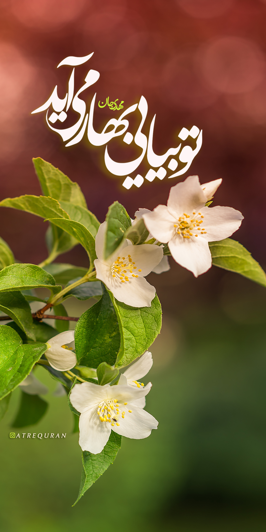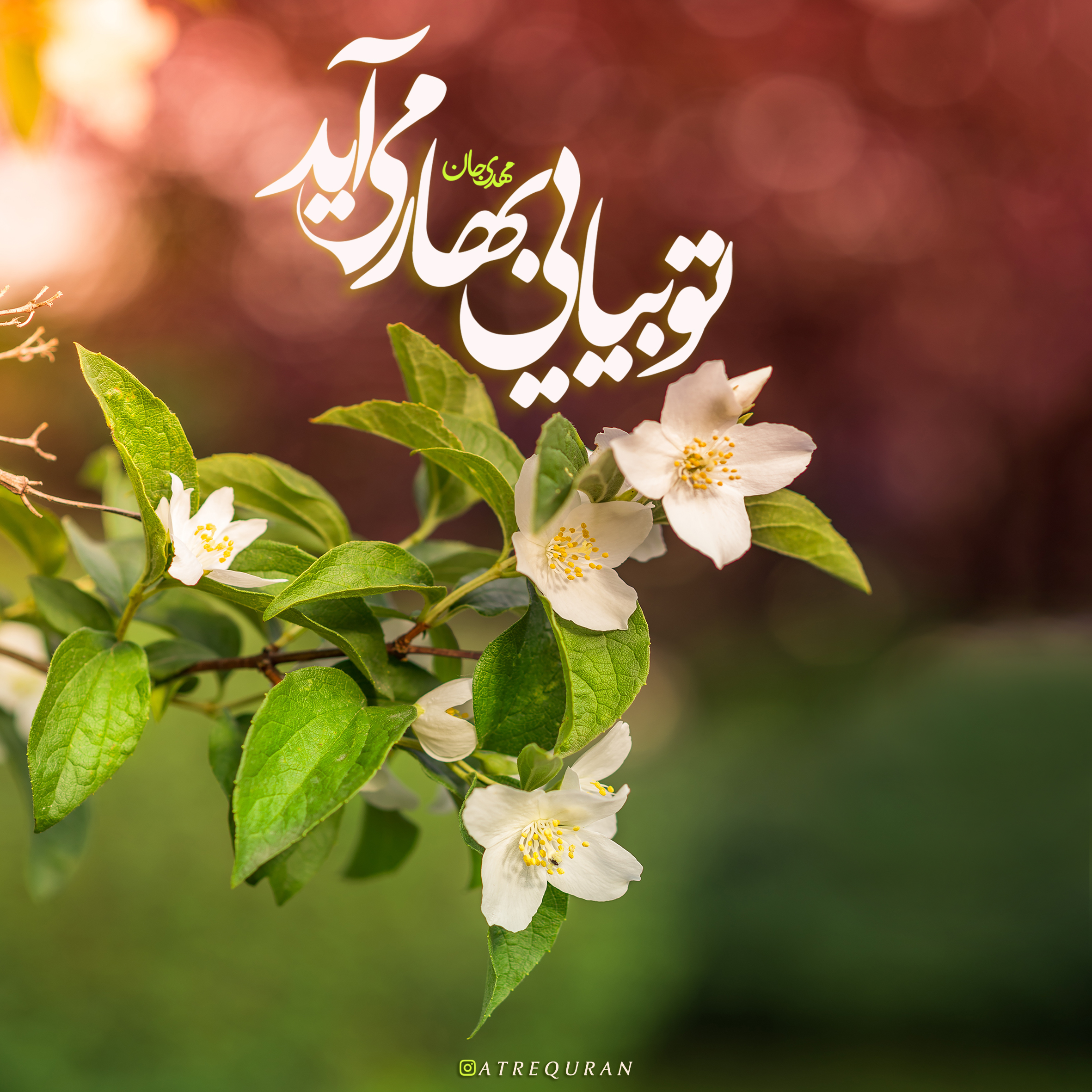 وقتی پاییز میآید دلم میگیرد ابرها میبارند برگها میریزند انگار همه چیز میمیرد و همچنان پاییزهای عمرمان میگذرند و ما منتظر بهار آمدن تو هستیم وقتی بیایی زمین سبز میشود سبزهها میرویند گلها میشکفند و شاخههای خشک شکوفه میدهند آری، تو بیایی بهار می آید، مهدی جان اللهم عجل لولیک الفرج