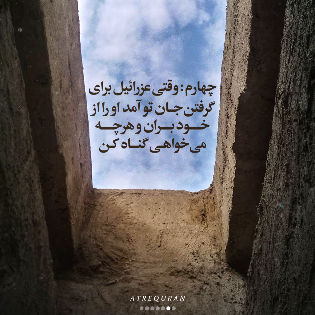 چهارم: وقتی عزرائیل برای گرفتن جان تو آمد او را از خود بران و هر چه می خواهی گناه کن.