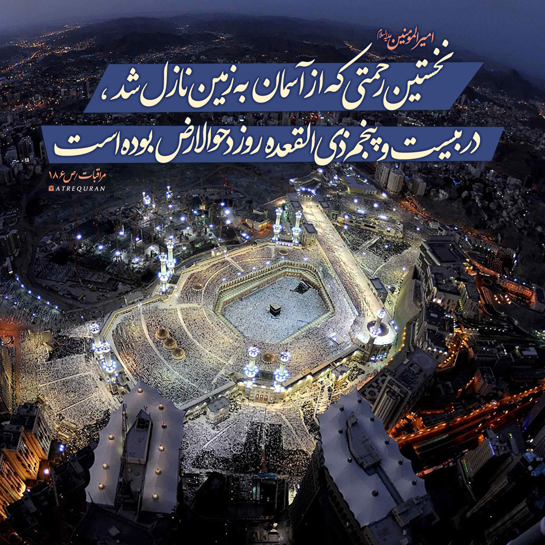 از حضرت علی علیه السلام روایت است که فرمود : « نخستین رحمتی که از آسمان به زمین نازل شد ، در روز بیست و پنجم ماه ذیالقعده ، روز دحوالارض بوده است و هرکس این روز را روزه بدارد و شب آن را به عبادت بپردازد ، به پاداش عبادت صد ساله رسیده است ؛ عبادت صد سالهای که روزهای آن را به روزه و شبهای آن را به عبادت گذرانیده است . و هر جماعتی که در این روز گِرد هم آیند و به ذکر پروردگار بپردازند ، پراکنده نخواهند شد مگر آنکه خواستههای آنان برآورده خواهد شد و در این روز هزاران رحمت از سوی پروردگار نازل میشود که نودونه درصد آن از آنِ کسانی است که روزش را به روزه و ذکر مشغول باشند و شبش را به احیا و عبادت بپردازند .»