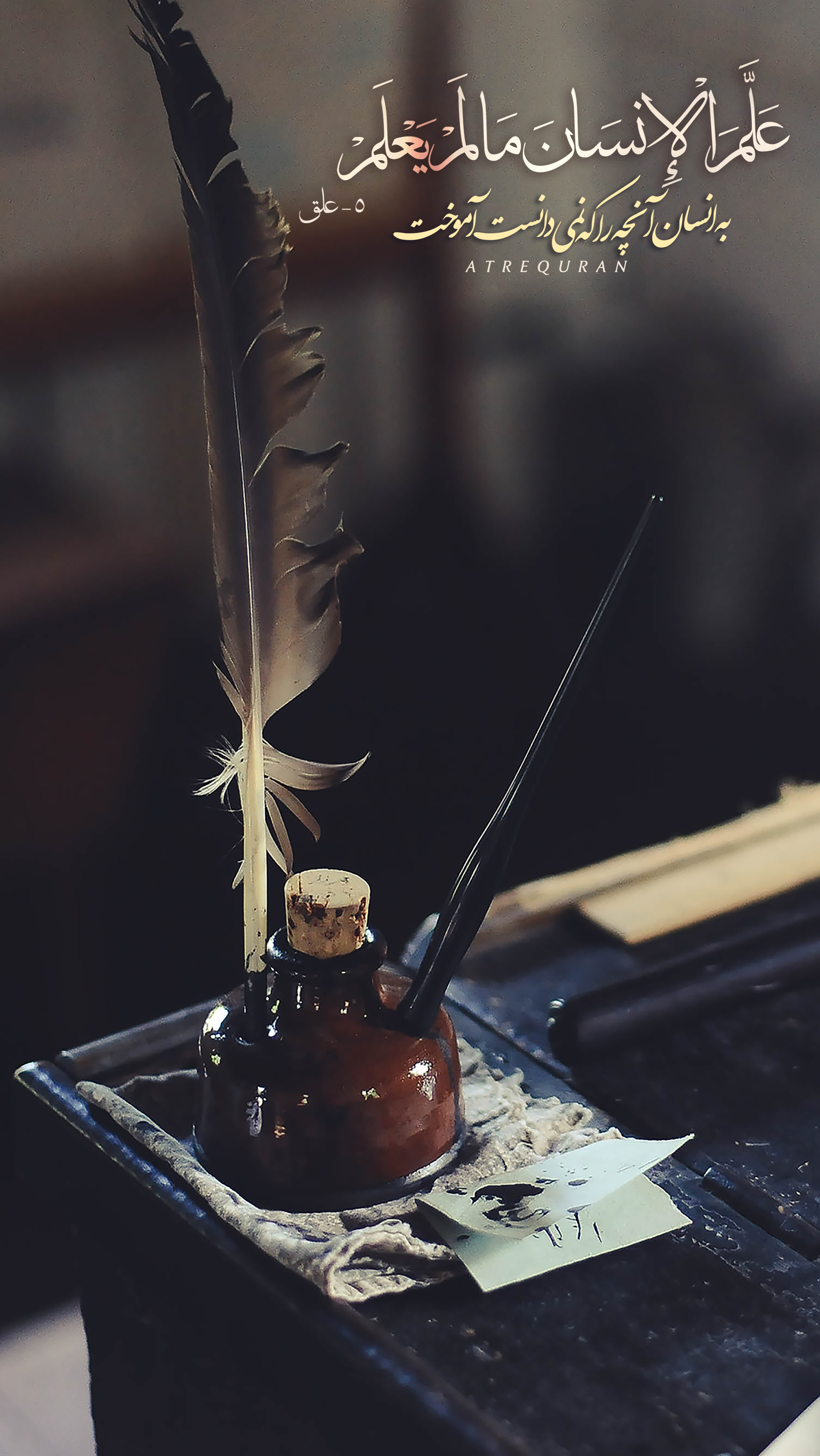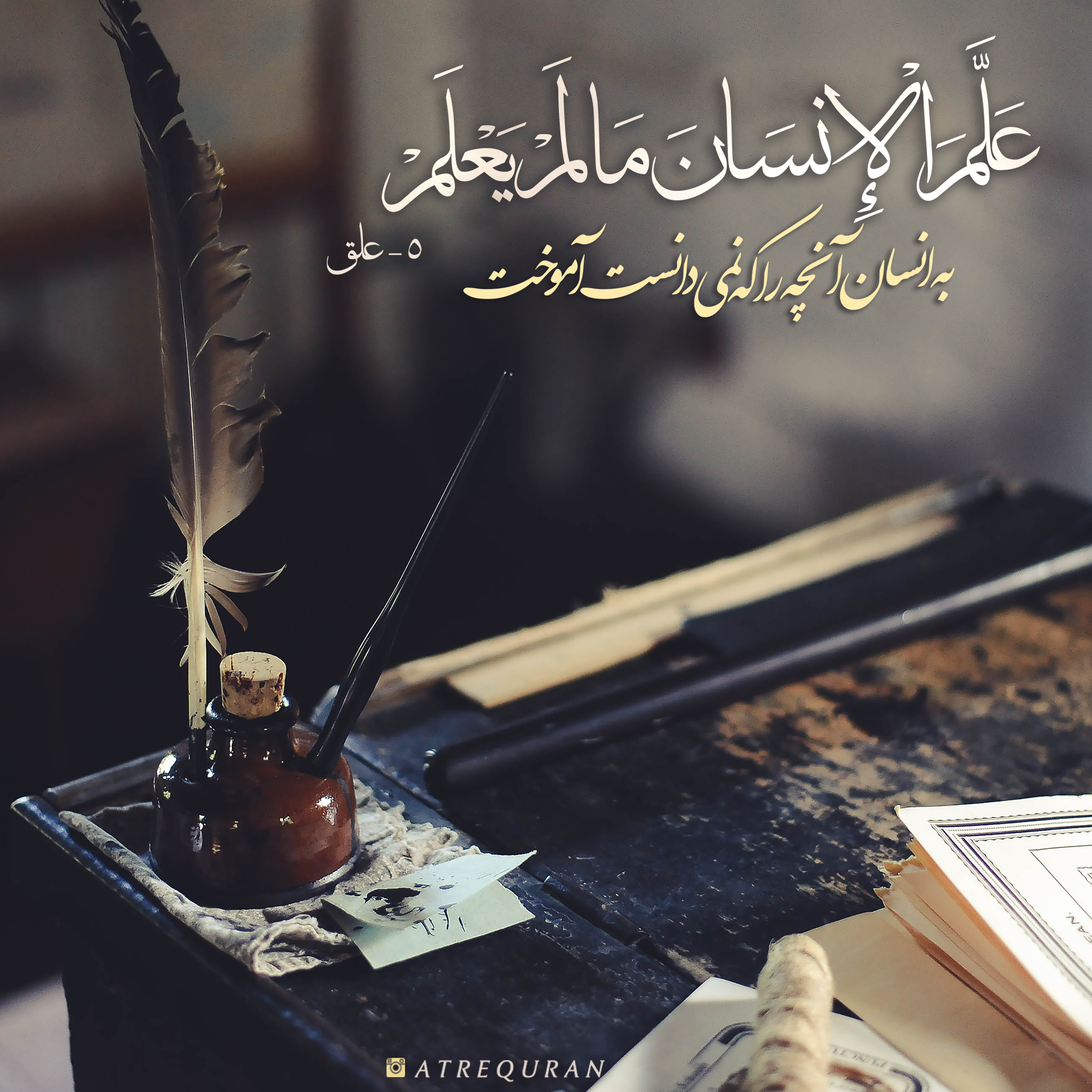 اقْرَأْ بِاسْمِ رَبِّكَ الَّذِي خَلَقَ «1» خَلَقَ الْإِنْسانَ مِنْ عَلَقٍ «2» اقْرَأْ وَ رَبُّكَ الْأَكْرَمُ «3» الَّذِي عَلَّمَ بِالْقَلَمِ «4» عَلَّمَ الْإِنْسانَ ما لَمْ يَعْلَمْ «5»