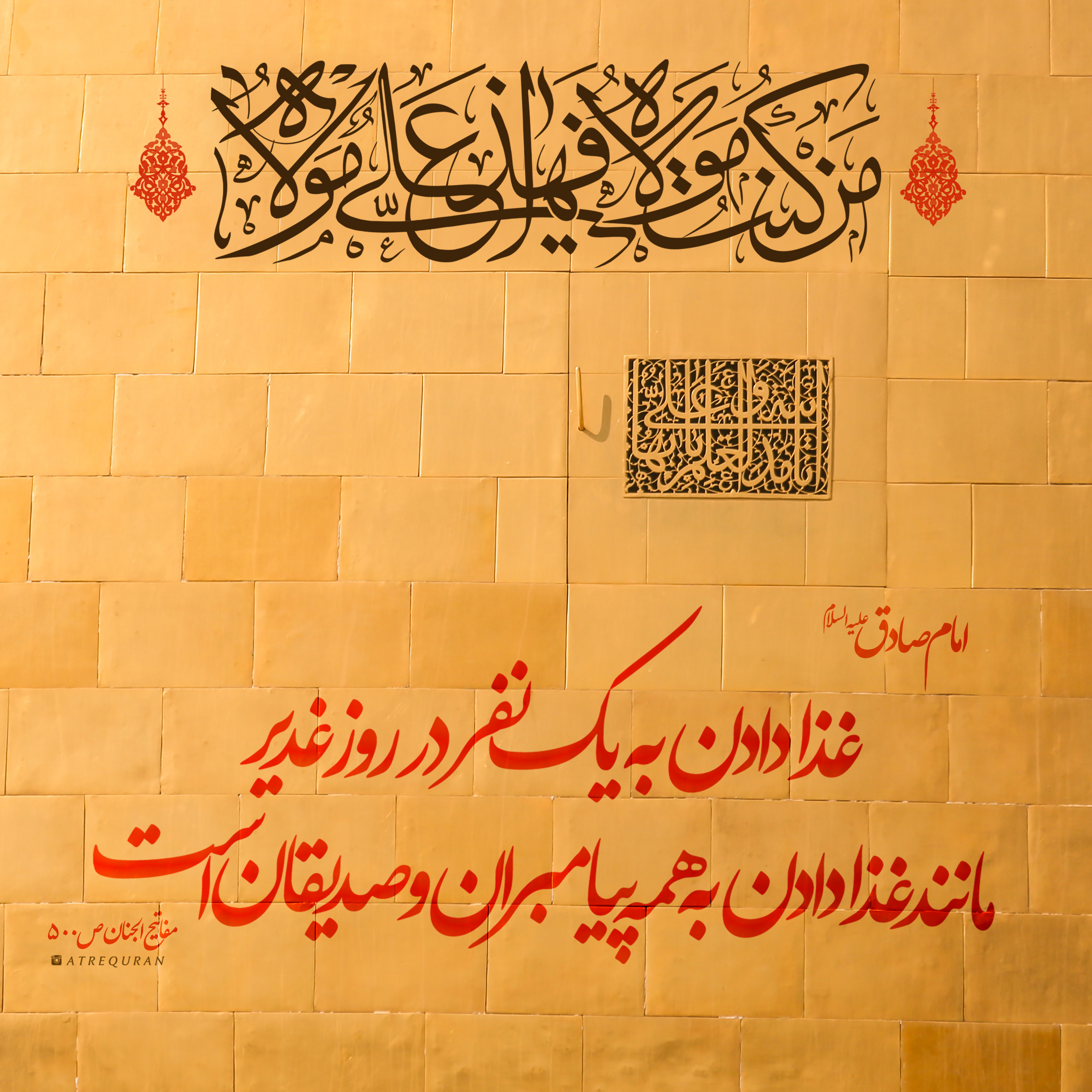 . ♦️امام صادق(ع) فرمود: غذا دادن به یک مومن در روز عید غدیر ثواب اطعام یک میلیون پیامبر و صدیق (در راس آنها خود ائمه معصومین) و یک میلیون شهید (در راس آنها حضرت عباس و شهدای کربلا) و یک میلیون فرد صالح در حرم خداوند را دارد. (بحار ج۶ ص ۳۰۳)