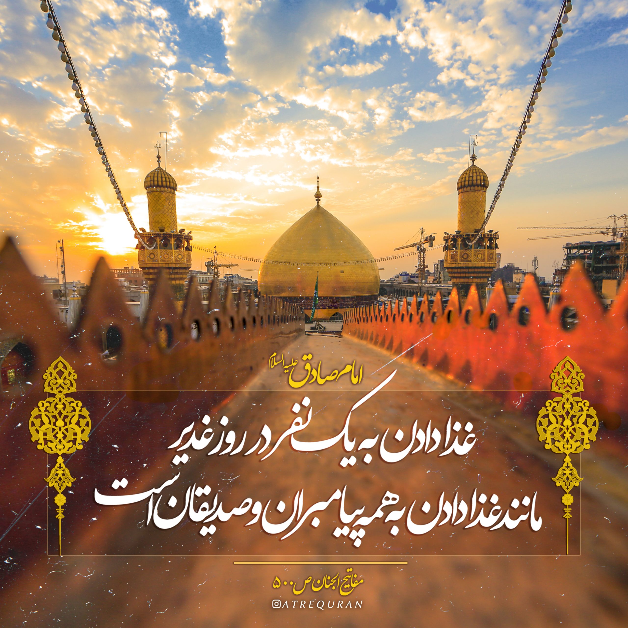 ?امام صادق(علیه السلام) فرمود: عید غدیر، روزى است که رسول خدا(صلی الله علیه و آله)، على(علیه السلام) را به عنوان پرچمدار براى مردم برافراشت و فضیلت او را در این روز آشکار کرد و جانشین خود را معرفى کرد، بعد به عنوان سپاسگزارى از خداى بزرگ آن روزه را روزه گرفت و آن روز، روز روزه دارى و عبادت و طعام دادن و به دیدار برادران دینى رفتن است. آن روز روز کسب خشنودى خداى مهربان و به خاک مالیدن بینى شیطان است: پس چه نیکوست در این عید بزرگ ضمن تهیه بهترین غذا برای خانواده، مومنین را نیز اطعام دهیم تا این سنت شریف فراموش شده احیا شود.