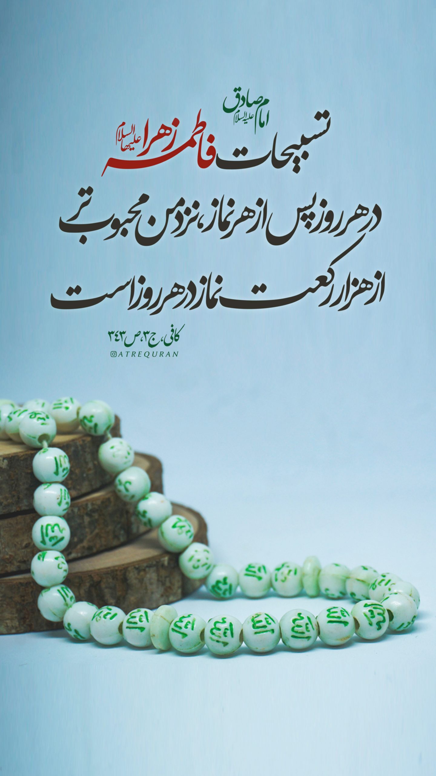 ◀️از امیرمومنان امام علی(ع) نقل شده، که فرمودند: «یکی از پادشاهان عجم برده ای به پیامبر(ص) هدیه نمود، من به فاطمه(س) گفتم نزد رسول خدا(ص) برو و خدمتگزاری برای خود درخواست کن. زهرا نزد رسول خدا رفت و این موضوع را با ایشان در میان گذارد، پیامبر(ص) فرمودند: «فاطمه جان! چیزی به تو دهم که برایت از خادم و آنچه در دنیاست بهتر باشد؛ بعد از نماز، 34 بار الله اکبر و 33 مرتبه الحمدلله و 33 بار سبحان الله بگو.