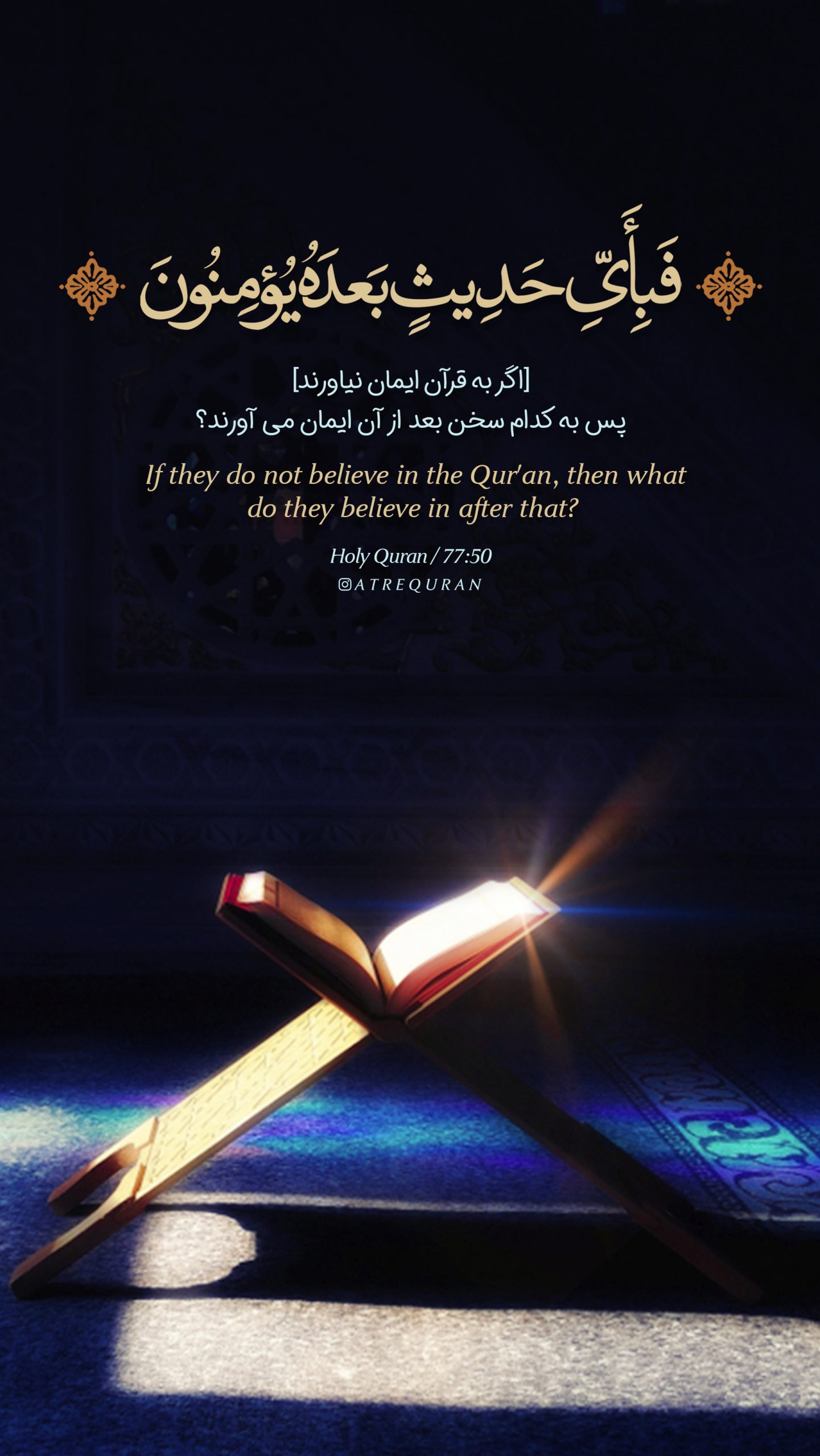 9- اگر كسى به قرآن ايمان نياورد، به كدام سخن ايمان خواهد آورد. «فَبِأَيِّ حَدِيثٍ بَعْدَهُ يُؤْمِنُونَ»