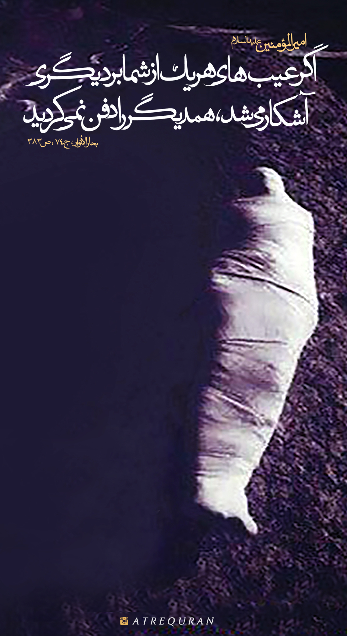 . ? امام جواد(ع) در پاسخ به عبدالعظیم حسنی از پدران بزرگوارش تا امیرالمؤمنین علیه السلام نقل میفرماید: لو تکاشفتم ما تدافنتم- اگر عیبهای هر یک از شما بر دیگری آشکار میشد، همدیگر را دفن نمیکردید. (بحار الانوار، ج 74، ص383)