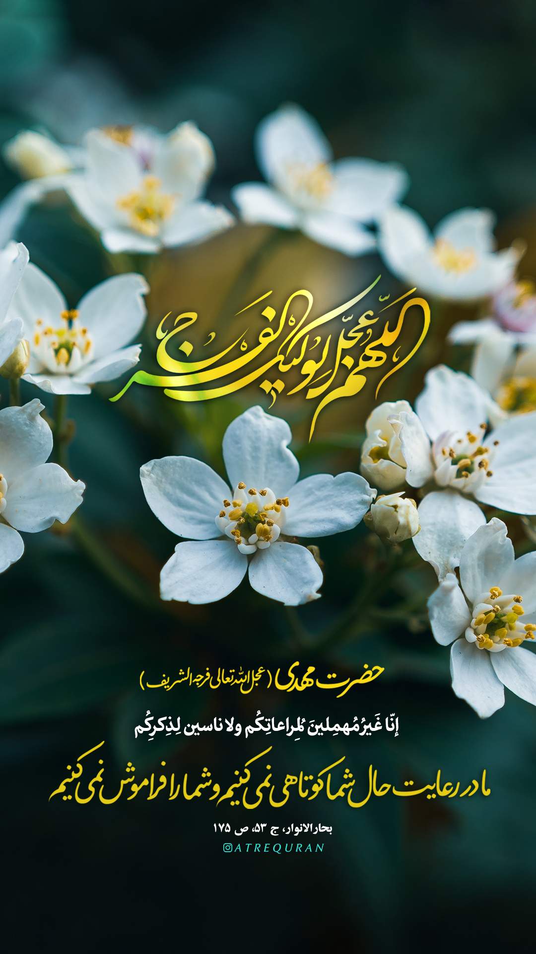امام زمان عج:إنّا غَيْرُ مُهْمِلينَ لِمُراعاتِكُمْ، وَ لاناسينَ لِذِكْرِكُمْ، وَلَوْلا ذلِك لَنَزَلَ بِكُمْ الْلَأواءُ وَاصْطَلَمَكُمْ الْأعْداءُ فـَاتـَّقـُوااللّه َ جَلَّ جـَلالُهُ.