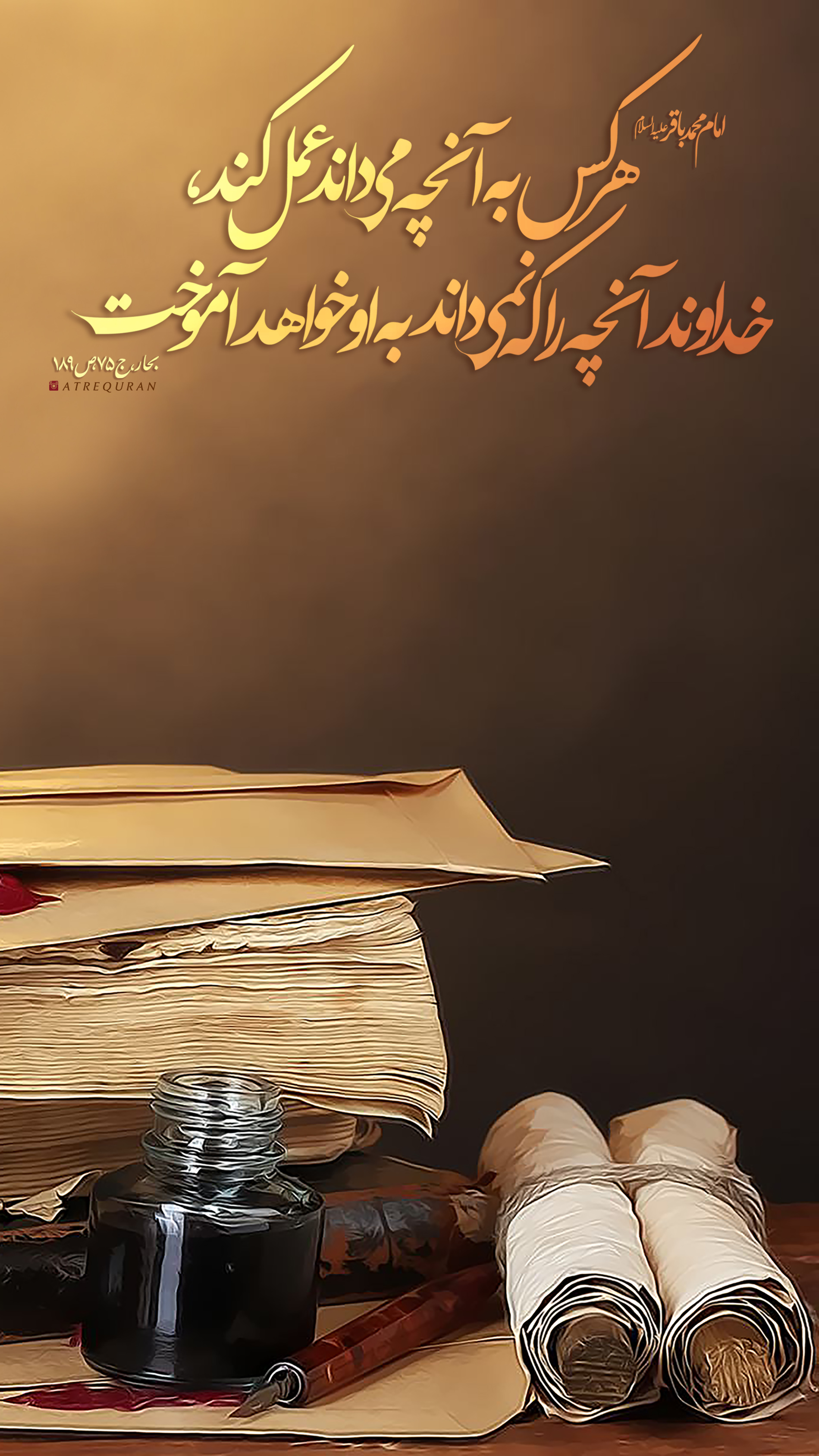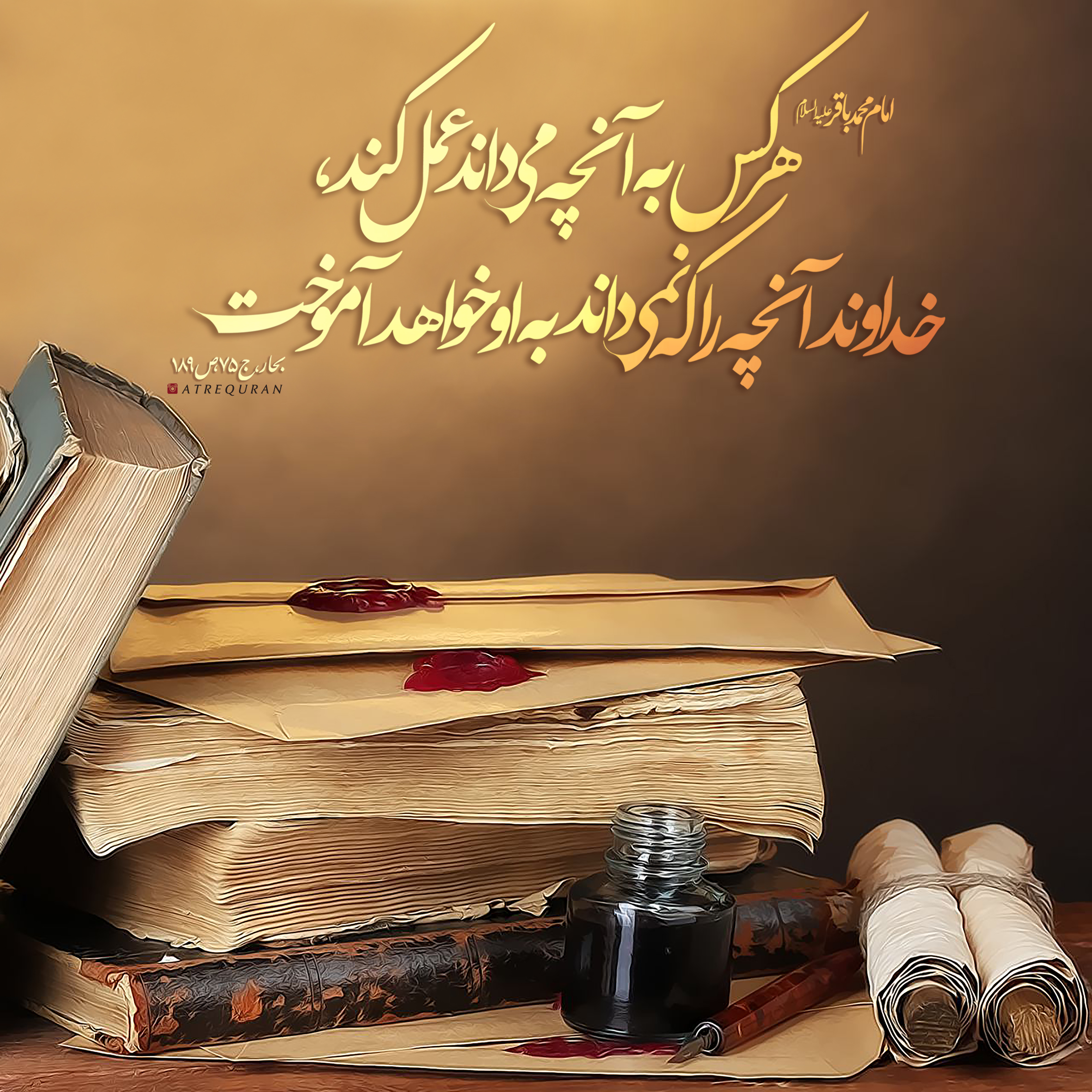 ?امام محمد باقر عليهالسلام : . . ◀️ مَن عَمِلَ بما یَعلَم عَلَّمَهُ الله ما لَم یَعلَم . . ?هر کس به آنچه که می داند ، عمل کند ، خداوند آنچه را که نمی داند ، به او خواهد آموخت.? . . . ?بحارالانوار : ج 78 ، ص 189 . . . ♦️امیرالمؤمنین علی علیه السلام در حدیث دیگری در این رابطه می فرمایند:??? . . . ?وقال امیرالمؤمنین علیه السلام: . . الْعِلْمُ مَقْرُونٌ بِالْعَمَلِ: فَمَنْ عَلِمَ عَمِلَ; وَ الْعِلْمُ يَهْتِفُ بِالْعَمَلِ: فَإِنْ أَجَابَهُ وَإِلاَّ ارْتَحَلَ عَنْهُ. . . . ?امام(عليه السلام) فرمود: علم با عمل همراه است و هركس (به راستى) عالم باشد عمل مى كند. علم، عمل را فرامى خواند اگر اجابت كرد و آمد، علم مى ماند و الاّ كوچ مى كند. امام(عليه السلام) در اين گفتار حكيمانه به نكته مهمى درباره رابطه تنگاتنگ علم و عمل اشاره كرده، مى فرمايد: «علم با عمل همراه است و هركس (به راستى) عالم باشد عمل مى كند. علم، عمل را فرامى خواند اگر اجابت كرد و آمد، علم مى ماند و الاّ كوچ مى كند» . . . ?حکمت 366 نهج البلاغه . . . ?فردا، شهادت امام محمد باقر ع تسلیت باد ? . . . ? @AtreQuran ? . . . ?کپی حلال، فقط تگ داخل عکس رو پاک نکنید?