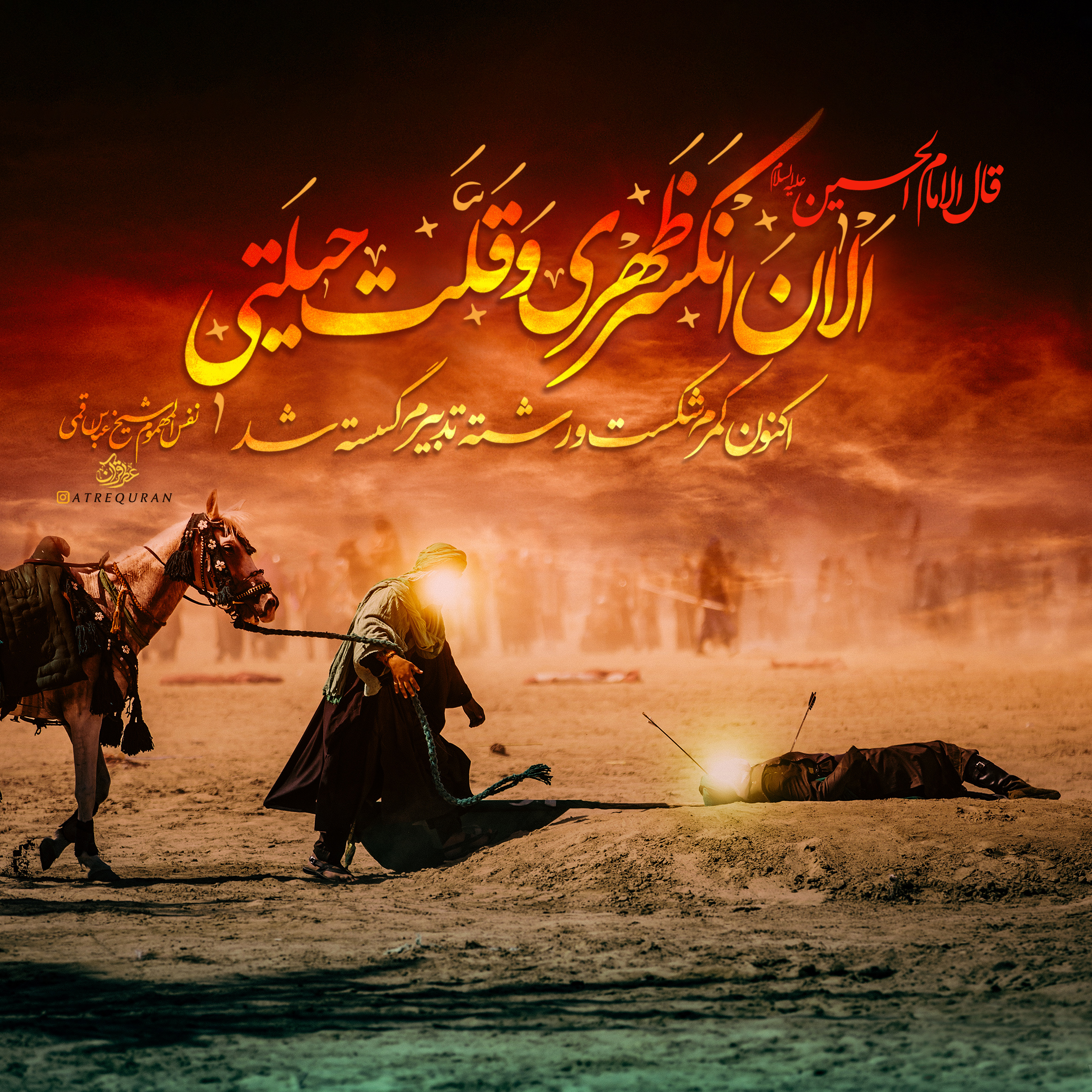 ◀️لشكر كه چنين ديدند راه او را گرفتند و از هر جانب او را احاطه كردند و آن حضرت مانند شير غضبان بر آن منافقان حمله مي كرد و راه خيمه گاه را مي پيمود. ناگاه نوفل الارزق و به روايتي زيد بن رقاد كمين كرده از پشت نخلي بيرون آمد و حكيم بن طفيل او را معين گشت و تشجيع نمود. پس تيغي حواله آن جناب كرده بر دست راست آن حضرت رسيد و از تن جدا گرديد. حضرت ابوالفضل (عليه السلام) به سرعت مشك را به دوش چپ افكند و تيغ را نيز به دست چپ داد و بر دشمن حمله كرد و اين رجز را مي خواند: