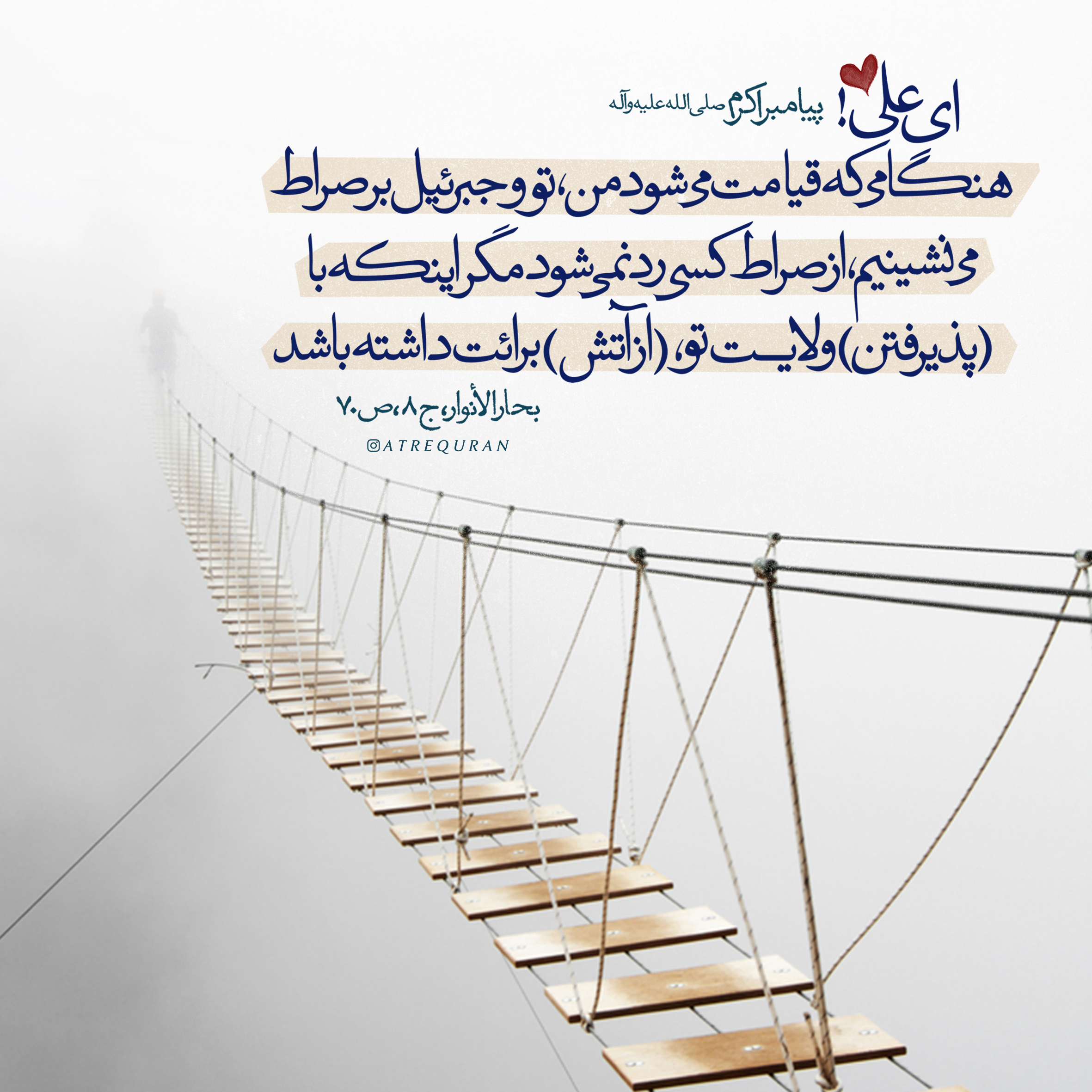 ?یَا عَلِیُّ إِذَا کَانَ یَوْمُ الْقِیَامَهِ أَقْعُدُ أَنَا وَ أَنْتَ وَ جَبْرَئِیلُ عَلَی الصِّرَاطِ فَلَا یَجُوزُ عَلَی الصِّرَاطِ إِلَّا مَنْ کَانَتْ مَعَهُ بَرَاءَهٌ بِوَلَایَتِکَ?
