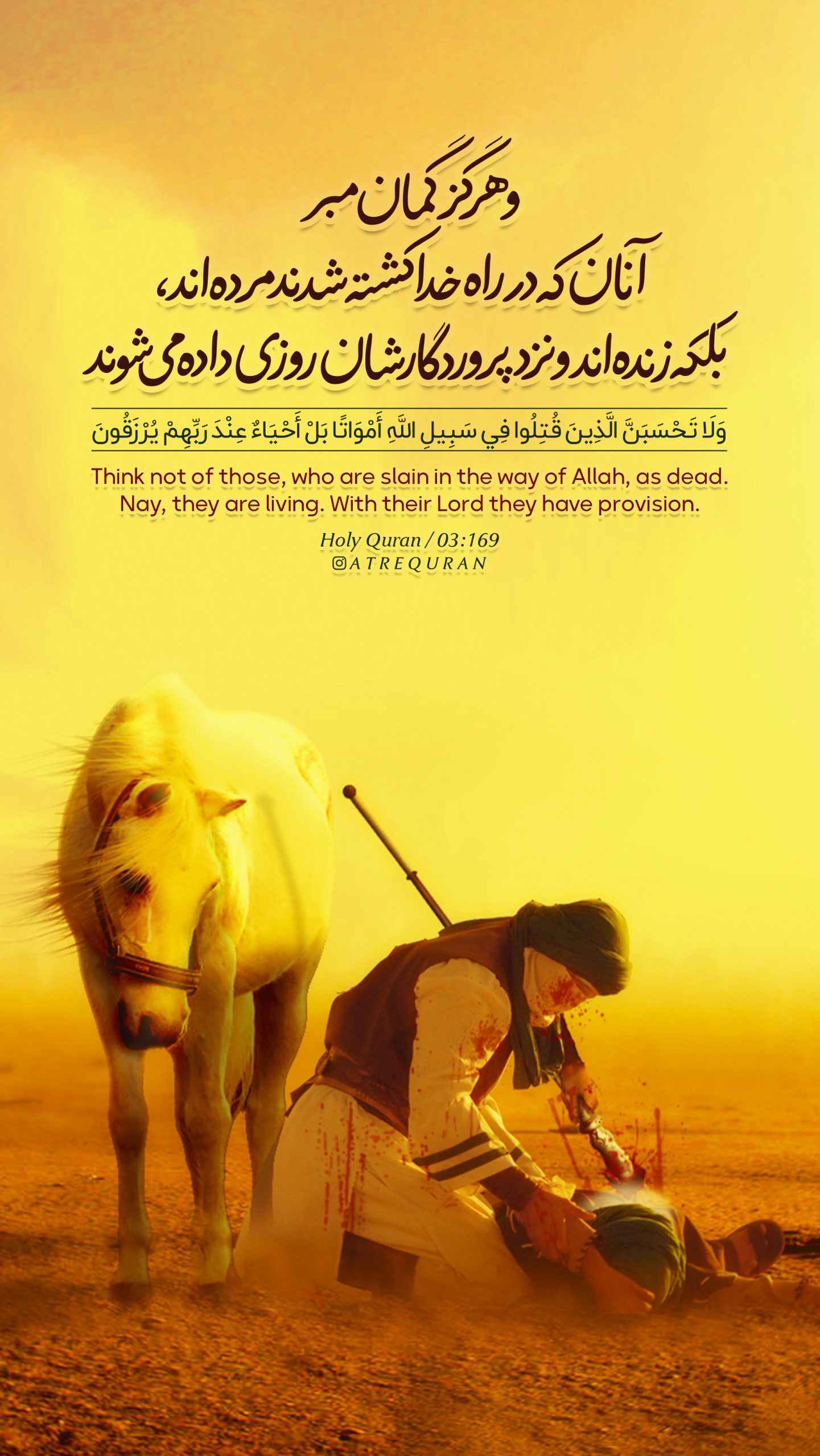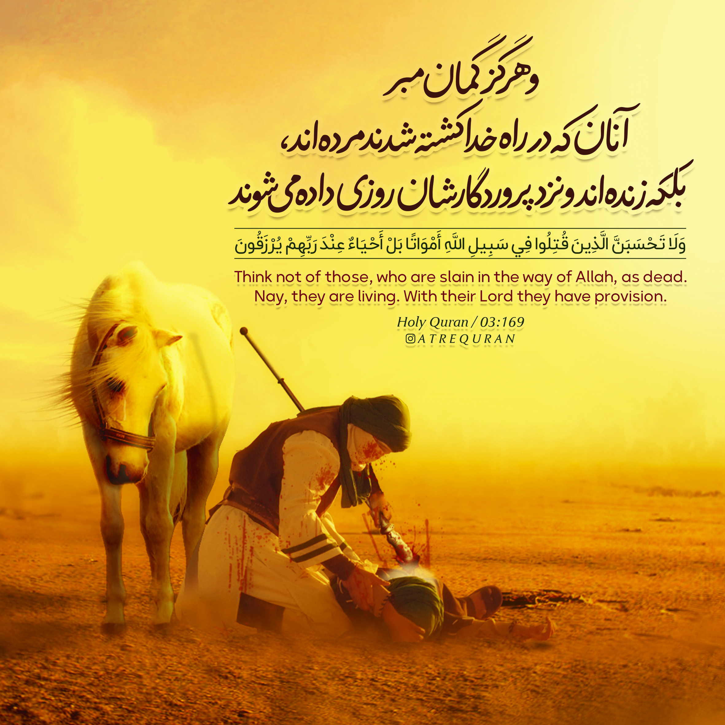 و هرگز گمان مبر آنها كه در راه خدا كشته شدهاند، مردگانند؛ بلكه آنها زندگانى هستند كه نزد پروردگارشان روزى داده مىشوند.