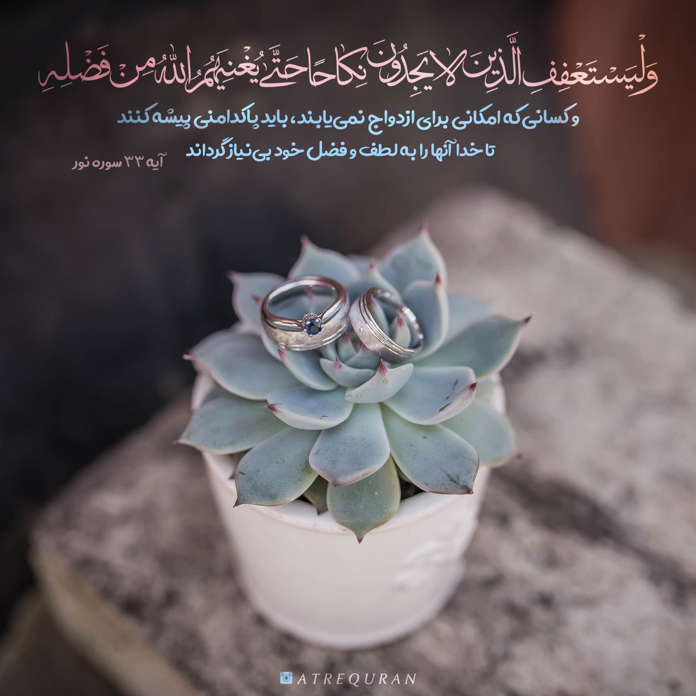 . ?ولْيَسْتَعْفِفِ الَّذِينَ لَا يَجِدُونَ نِكَاحًا حَتَّىٰ يُغْنِيَهُمُ اللَّهُ مِنْ فَضْلِهِ (آیه 33 سوره مبارکه نور)